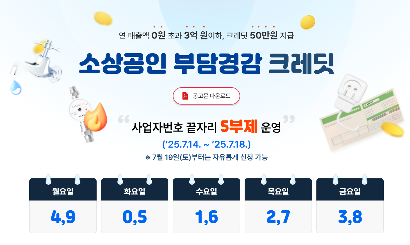 소상공인을 위한 부담경감 크레딧 지원사업이 시작됐습니다. 신청만 하면 최대 50만 원의 디지털 포인트를 공과금 및 4대 보험료 납부에 사용할 수 있어요!