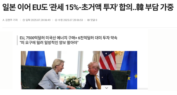 일본은 7월 23일 이미 협상을 타결하고 15% 관세와 5,500억 달러 투자를 정리했습니다. 반면 한국은 8월 1일 관세 발효 직전 급히 협상에 참여하며, 준비 부족 상태에서 밀린 협상을 했다는 평가가 나옵니다.