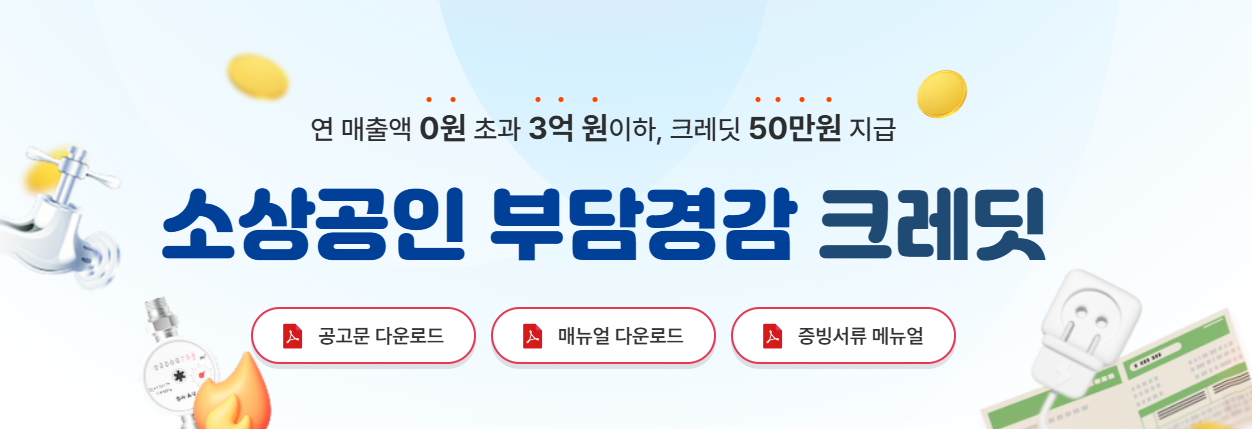 전기요금·가스요금 등 매달 빠져나가는 고정비, 이제는 정부가 일부를 대신 내드립니다. 2025년부터 시행되는 부담경감크레딧 제도는 연매출 3억 이하 소상공인을 대상으로 공공요금 및 4대 보험료를 최대 50만 원까지 지원하는 사업입니다.